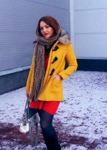 Black, blue, golden colors are suitable for red outerwear. For mustard, the ideal companions will be blue, burgundy and beige additions. The yellow coat will sparkle with its paint in combination with green, dark brown, purple and black.