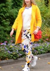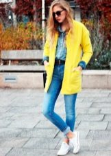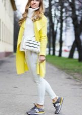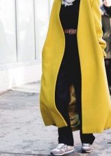 With a yellow coat sneakers from neutral colors will look good. Yellow is a bright and self-sufficient color that will be the soloist of your image. Therefore, the look itself may consist of black, gray, white. Blotches of deep saturated shades are possible - burgundy, navy blue, dark green.