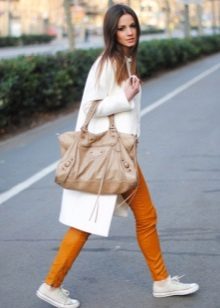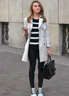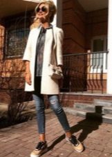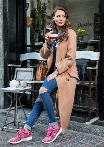 Another great choice - beige coat, to which you can also come up with a lot of interesting combinations. If you want something not commonplace, choose sneakers of turquoise, pink or wine shade. Bright colors allow you to show your personality.
