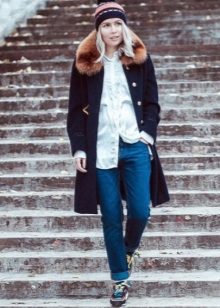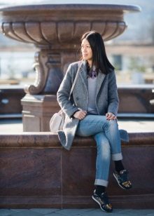 Jeans of almost any style will look stylish, except flared jeans remain controversial. Boyfriends who look great with a coat below the knee will look interesting. If you chose a shortened version of the top, it is better to give preference to a skinny.
