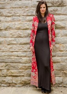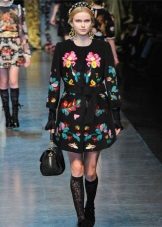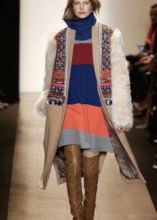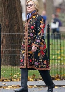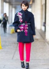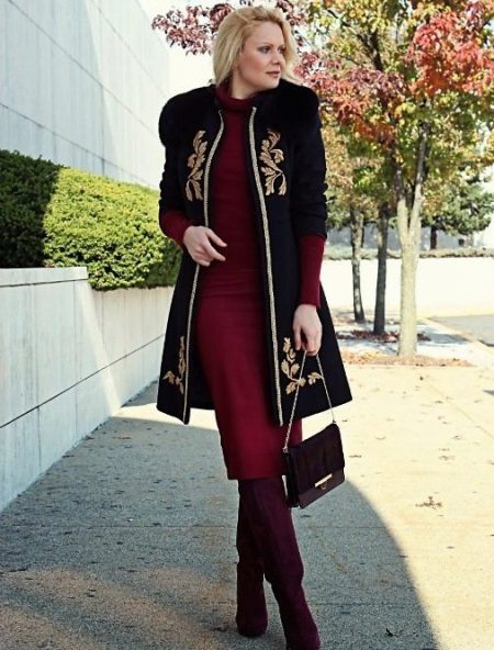 Dresses, skirts, sundresses. The embroidered coat complete with these clothes looks very elegant and festive. Especially if the created image is complemented by beautiful high-heeled shoes, narrow suede wedge boots or graceful ankle boots. Do not forget that the brighter and more abundant the coat is decorated, the more modest the rest of the clothes should be - tights, shoes, a hat, accessories.