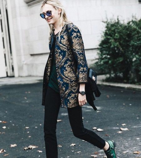 Jeans, trousers. A casual option that goes well with straight, sporty and shortened models. With flared coat models, you can wear skinny pants, with straight-cut models, let's say flared. To this alongside shoes without a heel perfectly fit.