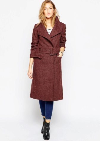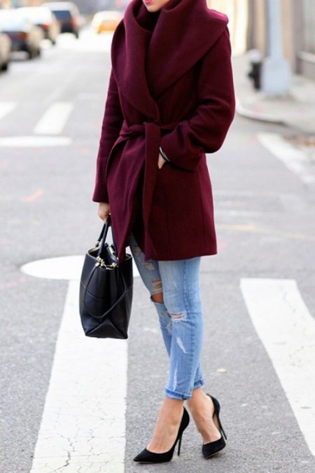 A coat with the smell of the fashionable color of Marsala, pumps in the tone of the bag and blue jeans are an excellent option for everyday tasks, remaining in excellent shape.