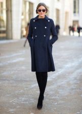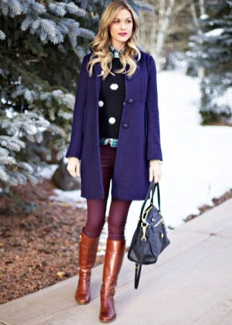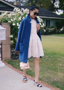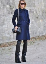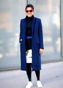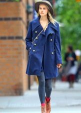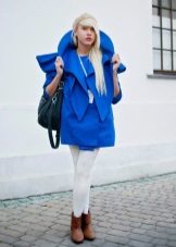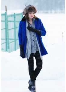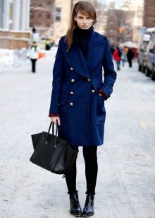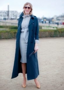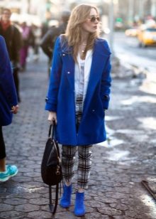 A blue coat is complemented perfectly with heeled shoes. You can wear models on a flat course, but then you need to choose tights to match the shoes.