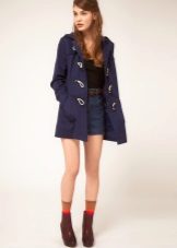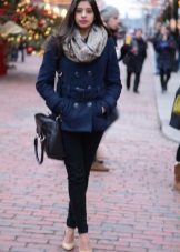 A short blue coat with a stand-up collar accepts jeans of dark shades. Shoes can be chosen on a flat sole, including sneakers or sneakers.