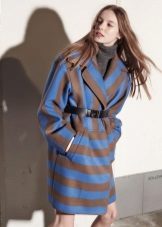 A fashionable blue coat with a flared hem and a wide belt should be combined with clothes that have floral or geometric prints: a flowing polka dot skirt or a dress with a pattern in the style of French Provence.