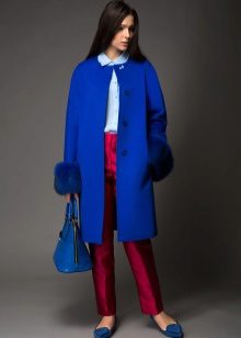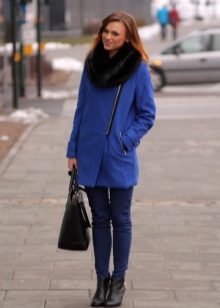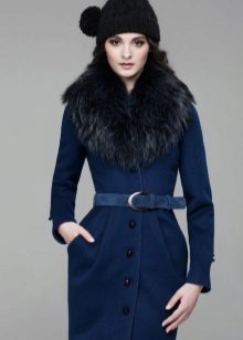 For winter, a model of a blue coat made of thick woolen fabric with a chic fur shawl collar is suitable. If you want to emphasize the waist, the outfit can be supplemented with a belt. In addition to the collar, fur trim is also shown for cuffs, lapels, pockets and hoods.
