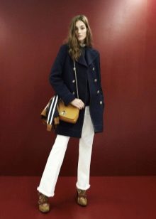 In addition to traditional classic single-breasted and double-breasted blue coats in English style, about the knee length, eminent trading houses present cropped unisex coats such as a jacket coat, trench coat, duffle coat and pea coat. The collar of such models is usually a turn-down or a stand.