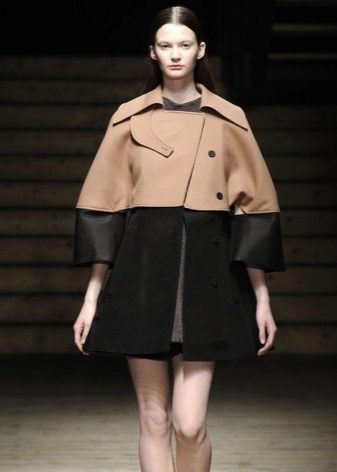 The most common length options for a trapeze coat are two models: to the thigh and at the knee level. The first option is more like a cloak, and the second is closest to the classics. The short model, in which the hem has a flared design, has been known since the advent of the trapeze coat. Modern designers often draw their ideas from those distant times.