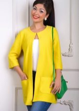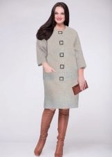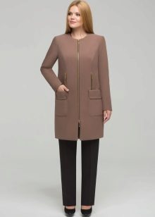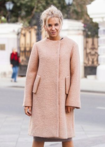 The Chanel-style coat does not have a collar, and has luxurious voluminous metal buttons and hidden pockets. Sleeve can be standard or ¾. Stylists advise wearing such a style with a sheath dress, skirt or straight-cut trousers.