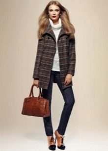 A small-cell coat looks bright and unusual, so it is best to combine it with neutral basic things. This may be the bottom of beige, brown, gray or black.