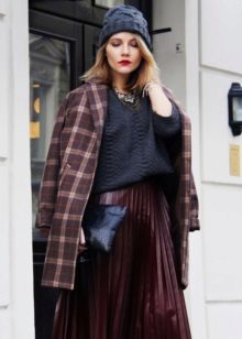 A leather skirt will look great with a short check coat. She will perfectly fit into city and street style.