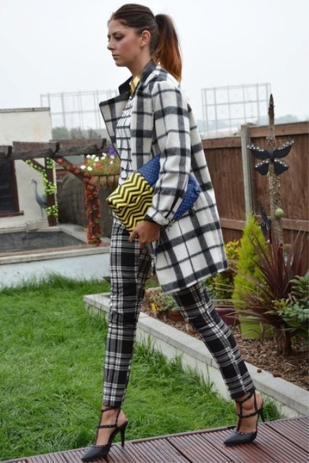 - If you are not afraid of experiments, try combining three checkered things in one look at once. The main thing is that they are made in one color scheme. Of course, black and white is the best option. This image can be complemented with bright accessories and high-heeled boats.