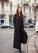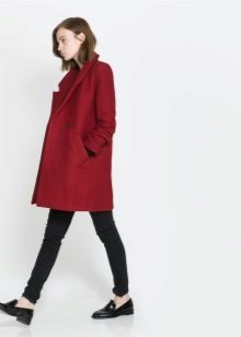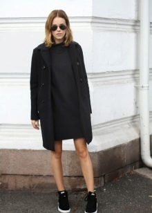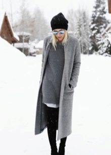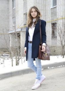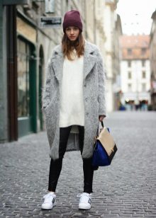 Do not wear a long coat with wide or flared trousers, it is better to use a skinny model or leggings. Sneakers are also not applicable, but plain slip-on sneakers are quite suitable.