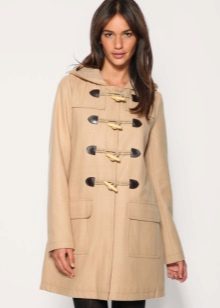 A button closure in the form of wolf fangs, the loops of which are made of cotton fabric as an independent element, is a distinctive feature of the coat model with a hood, which is called duffle coat.