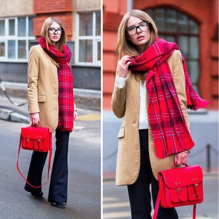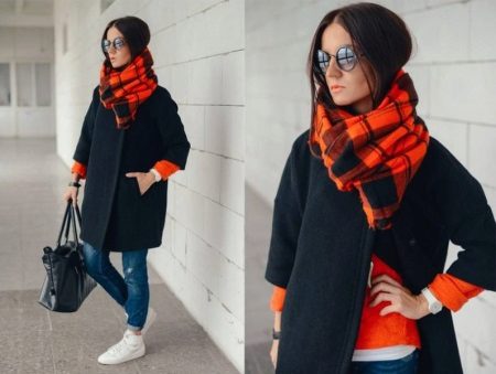 A very stylish and effective combination is obtained if you combine a black coat of classic length, made in the style of oversize and a bright orange checked scarf, which will become the highlight of the image. With this product, you can easily combine jeans - boyfriends and white high sneakers, which will give the image a casual style. And if the coat has a wide sleeve to the elbow or 3/4, you can wear a warm cashmere sweater with a long sleeve matching the scarf in color.