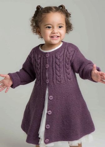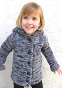The knitted coat model can be made of medium-density yarns and lined for extra strength. This will allow for a long time to maintain the shape of the coat. Too thick yarn does not look very good. Thick knitting immediately catches your eye, besides such a product can not be called light. Why does the child have an extra load? In addition, yarn that is too thick - even with a lining - will still begin to sag under its own weight. You will have to constantly adjust the lining, and this already leads to additional deformation of the product.