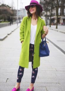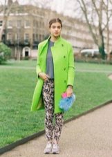 A bright green coat looks great in combination with other bright colors. For example, with such a yellow bag decorated with large spring flowers.