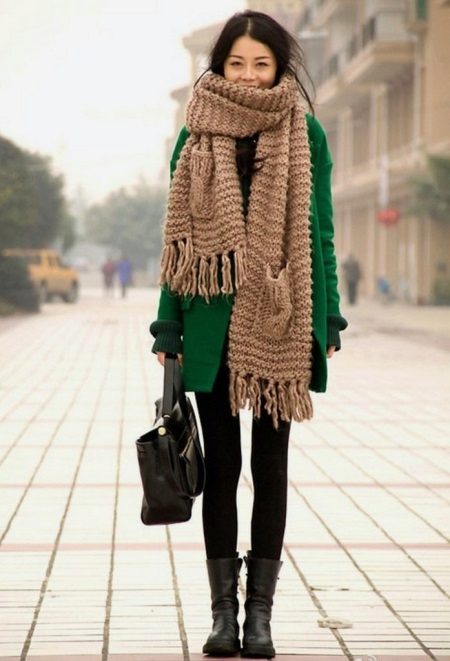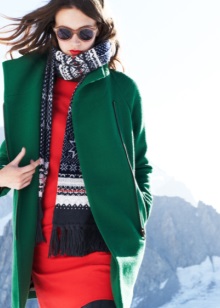A light scarf, for example, white, beige or milk, is perfect for a coat of saturated emerald color. The black shawl looks no less elegant. In addition, it is suitable for all other shades of the coat.