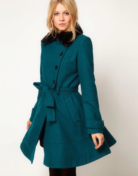 The fitted coat with a magnificent lower part looks incredibly beautiful and feminine. Such models are most often shortened or medium length. An interesting silhouette is fully revealed in models of bright, saturated colors.