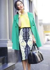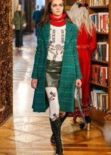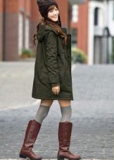 As for clothes, under a long green coat you can wear any item of clothing, whether it be a skirt, dress or pants. The style of the latter is better to choose not a flare. Shoes with a coat below the ankle will only look short, but always with a heel or platform.