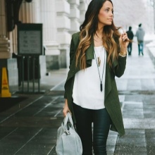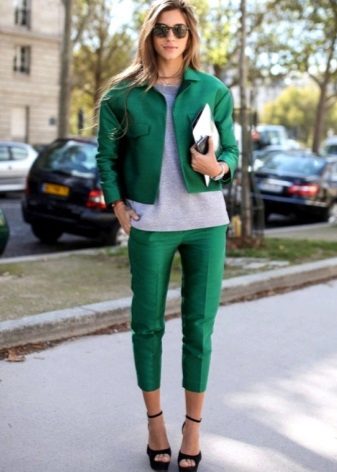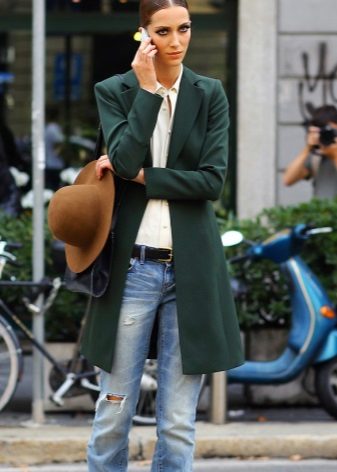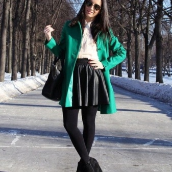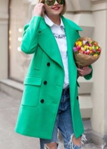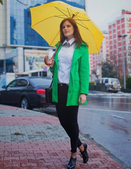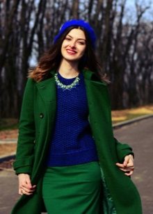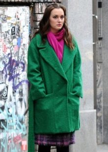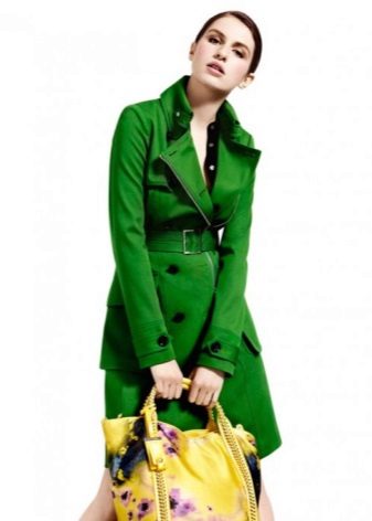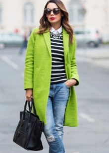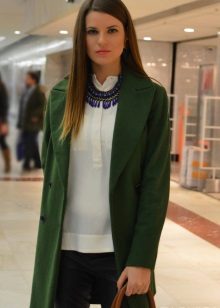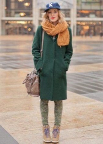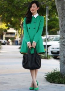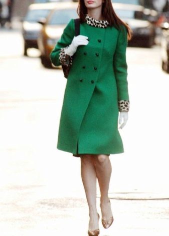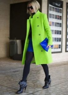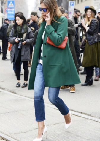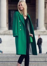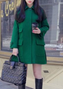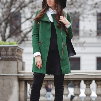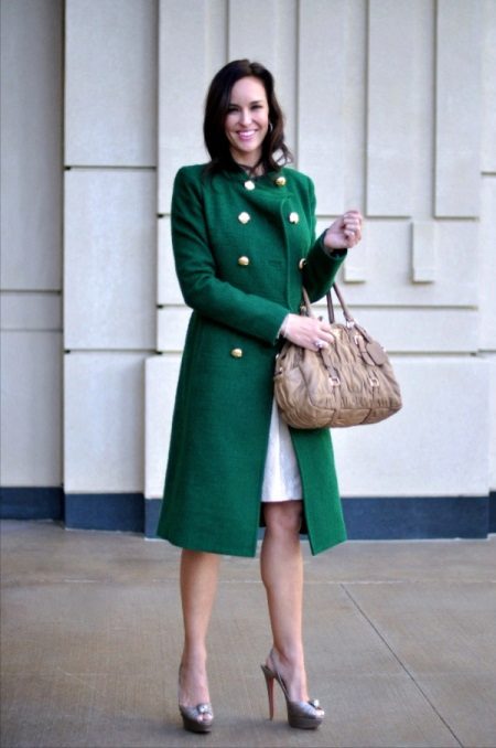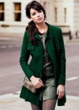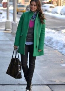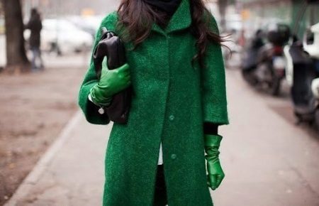 The green coat is designed to play a leading role in the image. Other items should be selected carefully. If the color of the coat is muffled, then you can afford gloves, a bag or a scarf of bright color, but a coat of a juicy shade will only be combined with pastel tones of accessories.