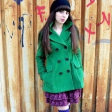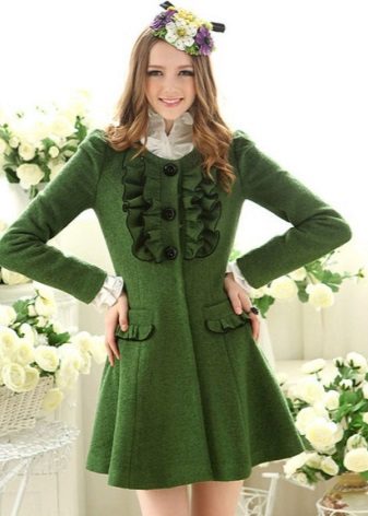 Fashionable youth styles of a green coat with a flared hem will look good with feminine dresses with floral patterns, puffy skirts and tights to match the shoes. Closed high-heeled shoes will look great on their feet.