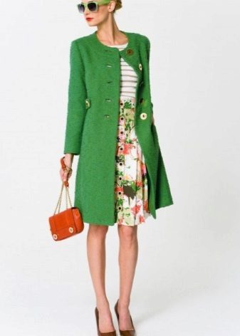 Coat without a collar in the style of Chanel green shade - a must-have for any fashionista. This model will especially adorn those with a long and thin neck. A sleeveless green coat or vest coat is usually worn with sweaters and turtlenecks. Using a belt will emphasize a feminine silhouette.