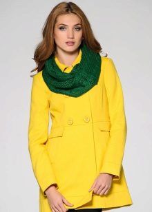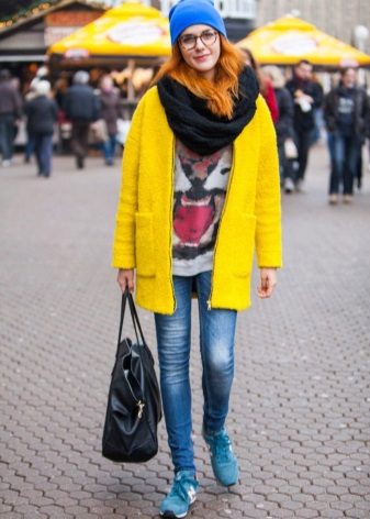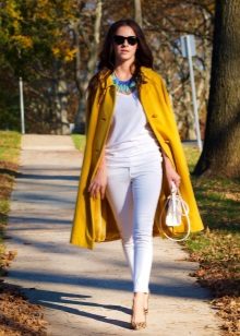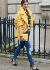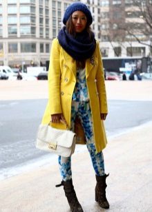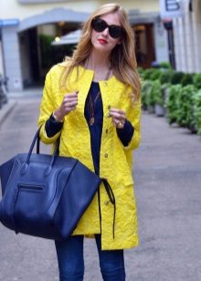 A yellow coat will harmoniously look with accessories of turquoise color. It can be bracelets, earrings, small handbags and other delicate accents.