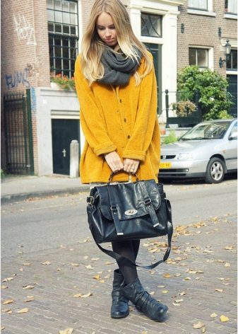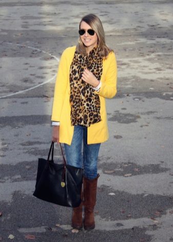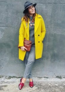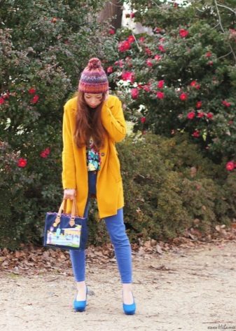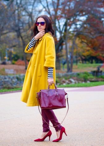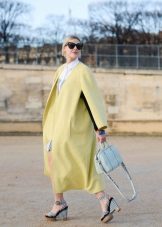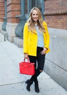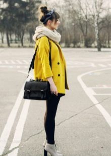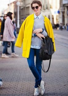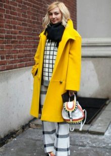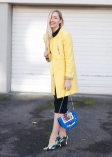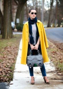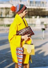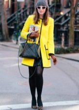 We already said that the yellow coat in itself serves as a bright accent of the image, therefore, in everyday images it should be worn with a bag of a neutral color - black, gray, beige. The bag will look stylish in saturated blue, blue or pink, it will give even more brightness to the image.