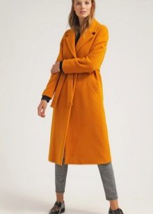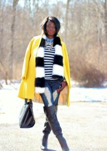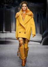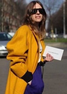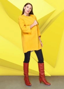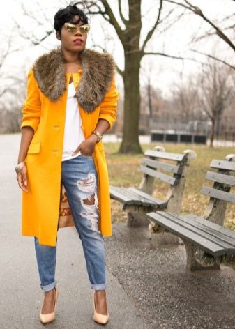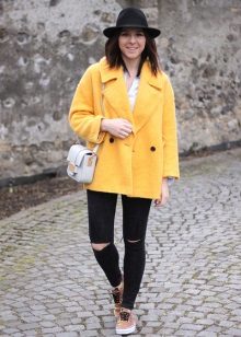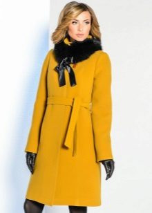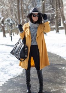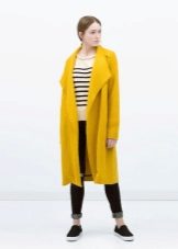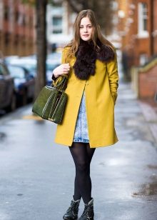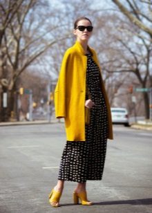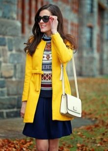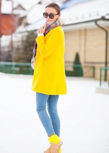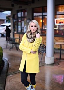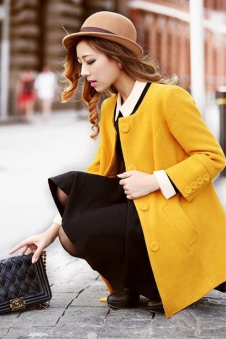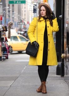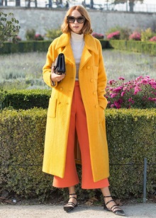 Coats that end in the knee area are most relevant. Such outerwear is very comfortable, it does not restrict movement, allows you to feel warm and comfortable.Long yellow coats are extremely rare, because they look too bright and attract much more attention.