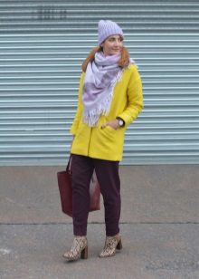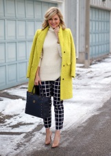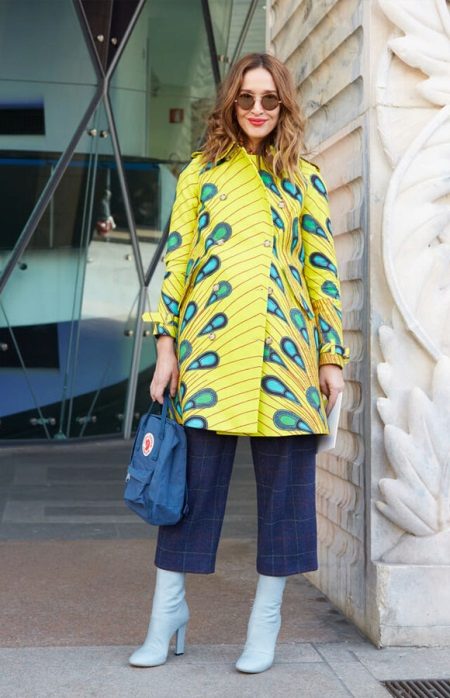 - Another stylish look: dark blue checked culottes, gray-blue heeled ankle boots, and a lemon coat with a bright print that resembles the plumage of an exotic bird. In this bright and fashionable image, you definitely will not go unnoticed!