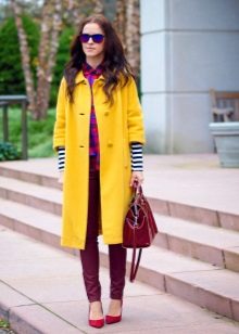 Complement your yellow coat with red accessories to create an original look. For example, a belt and a scarf around your neck will make you look unusual and elegant.