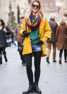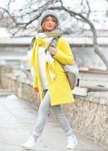 For a casual outfit, pair a yellow coat with gray accessories. Thanks to calm ornaments and a light scarf, you will get a discreet stylish look.