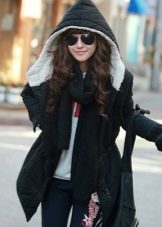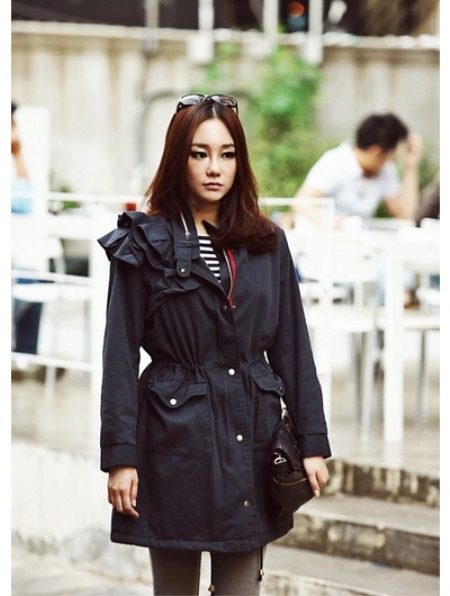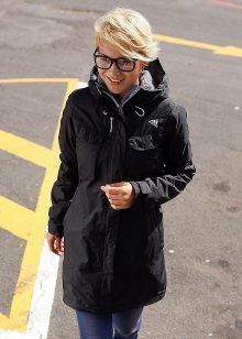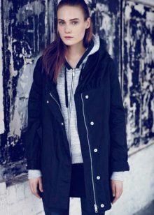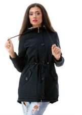 A thin black parka can quite replace an autumn windbreaker or a light raincoat. The model looks great with leggings or skinny jeans. Sunglasses and an elegant handbag are used as accessories. Excellent choice for every day.