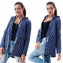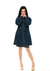 A summer version of a stylish and elegant jeans parka. The shortened model, slightly fitted with elastic, has an interesting decor. These are neat patch pockets with metal buttons and an emblem in the form of a centerpiece, snow-white ties at the waist, an interesting form of a clasp. A loose hood protects in windy conditions. Wrapped sleeves look original - a cute print in small polka dots peeps, decorating the inside of the product. With such a jacket, skinny jeans of a lighter tone organically look.