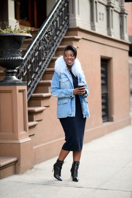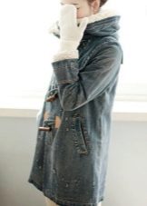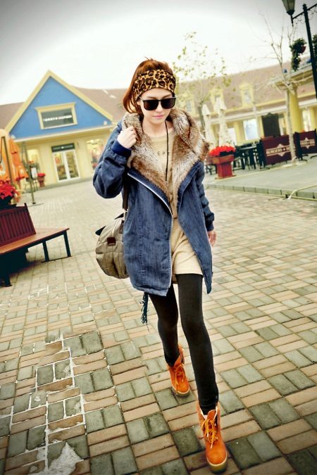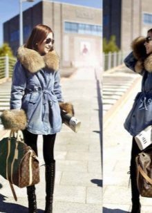 An interesting combination is a denim fur parka and a classic sheath dress. This duo is well suited with high-heeled boots. In addition, modern fashion allows you to wear even an evening dress under this outer clothing, if the occasion requires it. It is clear that shoes should be appropriate. Also under the denim park you can well put on a pencil skirt.