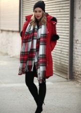 Another indicative image. The bright scarlet color of the parks emphasizes the young age of the girl, surprisingly suits her skin and hair color. A navy tunic and youth ripped jeans are a great complement to this outfit. We note with taste the selected accessory - a long checkered scarf with a fashionable fringe now, the color scheme of which is in harmony with the color of the furry fur of the collar of the jacket.