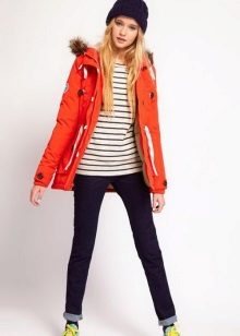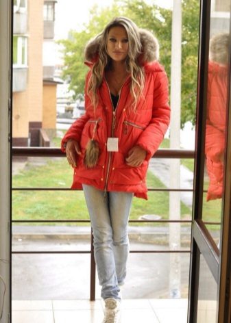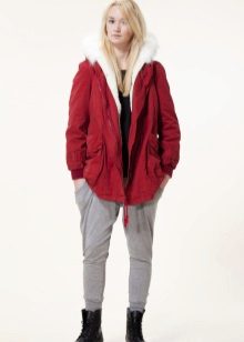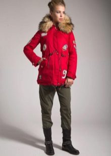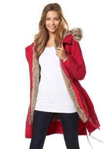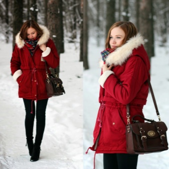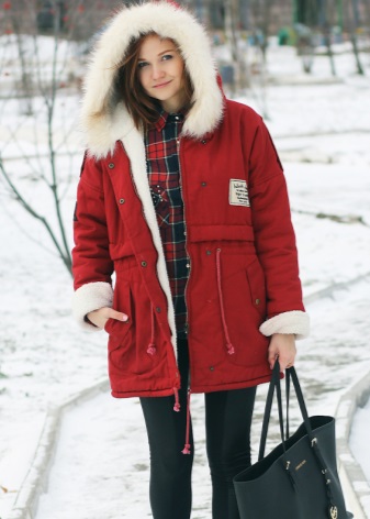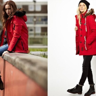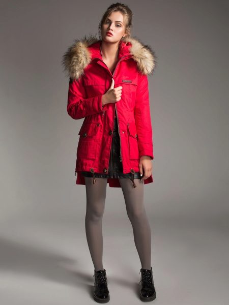 Red parka successfully combines with jeans of any shades and warm sweaters in classic black and white, as well as calm colors (gray, beige, coffee with milk). Leggings and tight trousers are also suitable for this outerwear. An option for a walk can be made by combining a red parka with short shorts worn in tight tights and matching shoes (for example, youth high-heeled boots or lace-up ankle boots).
