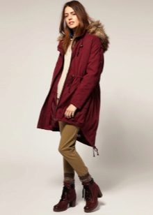 A different shade of red, close to burgundy. The parka jacket has a very spectacular finish with light fur that shimmers brightly in the sun. Also wrapped cuffs of sleeves look beautiful. Outerwear is successfully complemented by classic dark jeans.