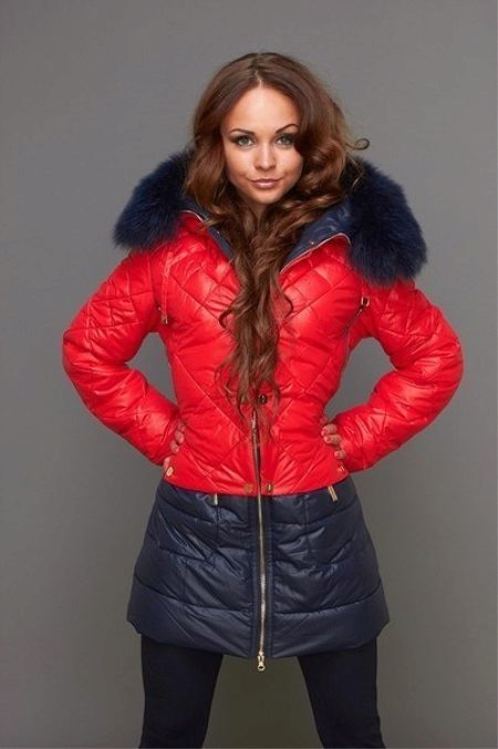 The original version of the winter park, built on a combination of bright red and dark blue. The top of the product is made in red, the blue fragment starts from the hip. Only a girl with a good figure, who has a thin waist, can afford such a model, since in this case all attention is focused on the torso. The fur and lining of the jacket are made in the same dark blue color. Dark jeans look appropriate in this ensemble.The swarthy skin color of the girl and her luxurious brown hair against the background of clothes look especially advantageous.