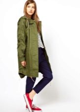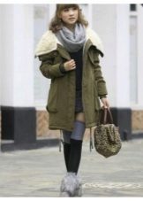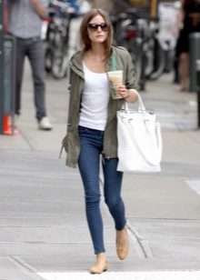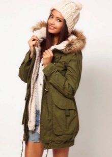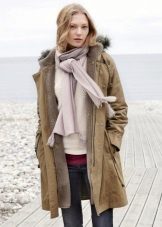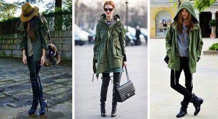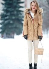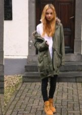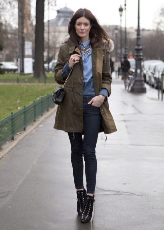 White trousers or jeans are suitable for the khaki parka, although at first glance this combination seems unexpected. It is especially good to combine them with shoes not black, but gray. It can be both timberland boots and more elegant models with or without heels.