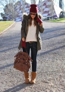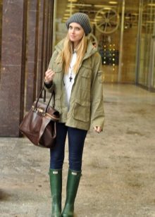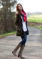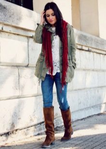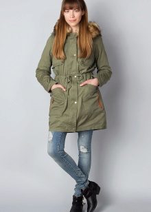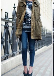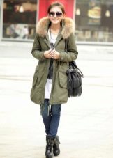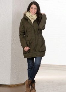 A green parka will look great with blue or blue jeans. They should pick up suede boots in gray or dark blue. It can also be a fashionable gray-brown shade - taupe. The color difference between jeans and shoes should not be too pronounced, it is good if it will be a smooth transition from one shade to another.