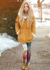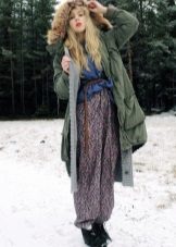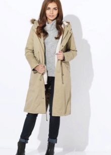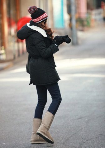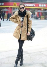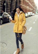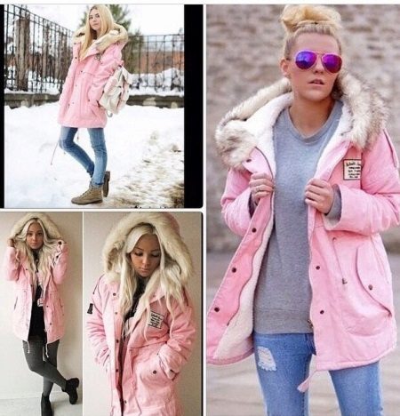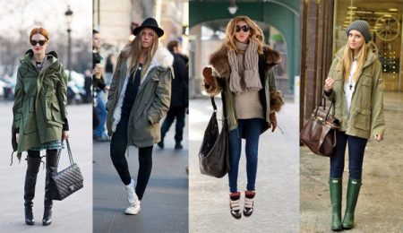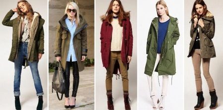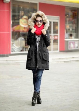 - With jeans or trousers. The long parka is perfect for the winter season, it goes well with leggings, jeans and trousers of various styles. Of course, it is best to choose straight or narrowed styles that will not get out of the overall style of the image.