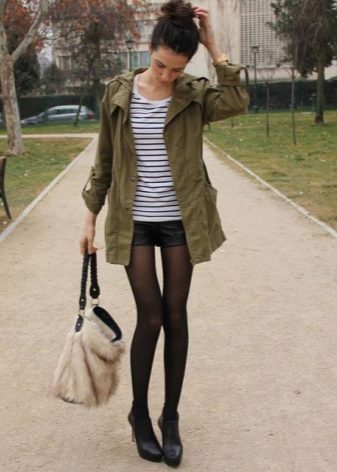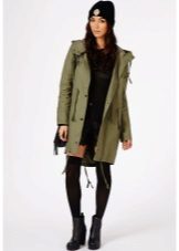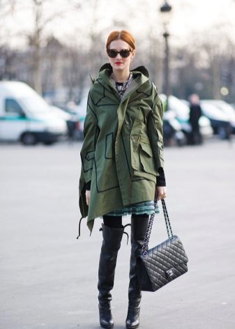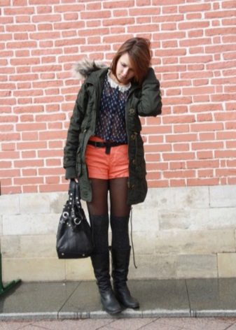 Khaki parka will look perfect with a black hem. It can be jeans, trousers or tights that smoothly turn into black boots or boots. Shoes can be leather, or even better - suede.
