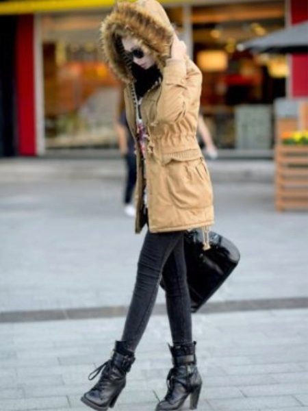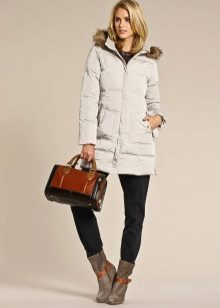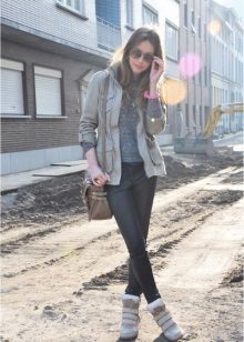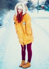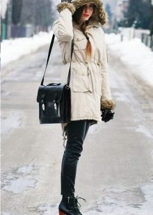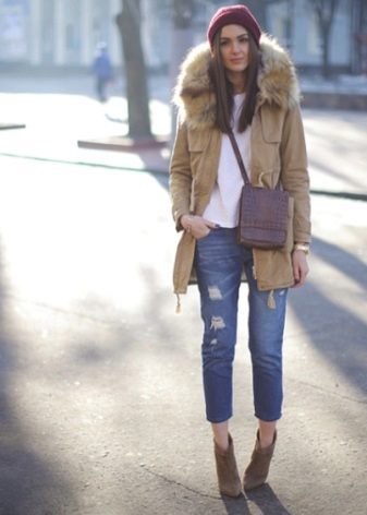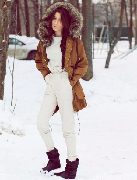 A parka blends best with suede shoes. For example, with flat timber timbers or thick heeled ankle boots, and the higher they are, the better. Light and rich colors are welcome: taupe, gray, olive, light green, beige, burgundy.