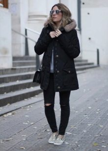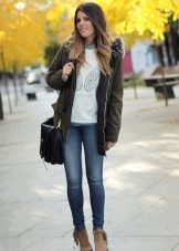 - With jeans and pants. A shortened parka will work well with tight skinny jeans. Of course, provided that you have slender legs that you are not afraid to show. Skinny pants can be an alternative to jeans, especially if they are jogger pants.