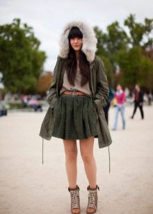 - With a skirt. A long airy skirt will look great with a shortened parka. This is a great option for the offseason, when there is no need to "warm up". A short skirt paired with sneakers is suitable for every day.Leather skirts that keep their shape look great.
