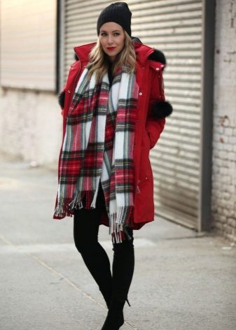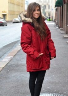 Black clothes will look great with a red parka, you can dilute the image with all kinds of shades of yellow and green. Also pay attention to brown clothes and accessories. It is softer than black, so the image with it will turn out to be more refined.