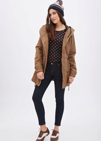 Also, a brown parka will look perfect with blue jeans of any shade. You can also experiment with red accessories, it can be a bag, gloves or a scarf.